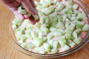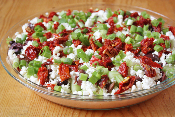 Top hummus with an even layer of the cucumbers, followed by the olives, then the feta cheese, sun-dried tomatoes and scallions.